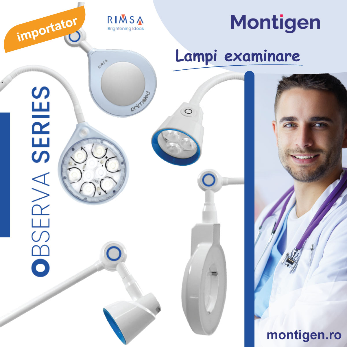 Lumina joacă un rol major în domeniul medical, fiind necesară pentru a oferi o imagine fidelă a ceea ce vede medicul în timpul examinarii medicale. Iluminarea adecvată creează condiții confortabile, reduce stresul și senzația de oboseală și crește productivitatea. Lampile din gama Observa de la Rimsa (Italia) sunt lampi cu brațul articulat ce oferă o rotație și stabilitate perfectă a lămpii, în timp ce brațul flexibil asigură o reglare ușoară a luminii. Forma rotundă și ultra-plată a luminii face ca produsul să fie ergonomic și potrivit pentru orice tip de instalare, de la cabinetul medicului până la unitate de terapie intensiva.